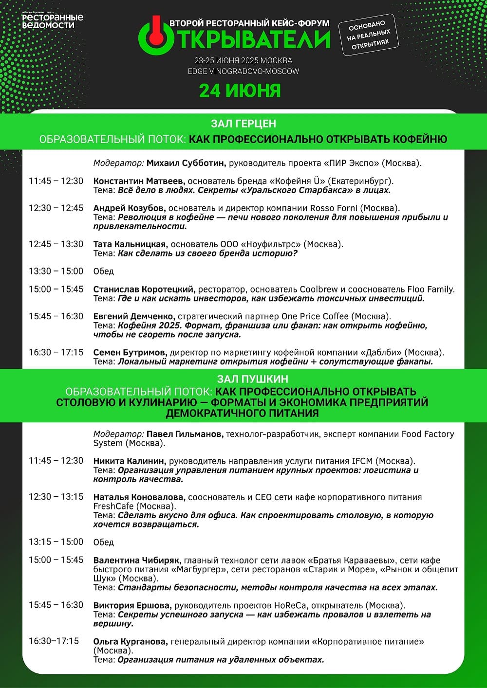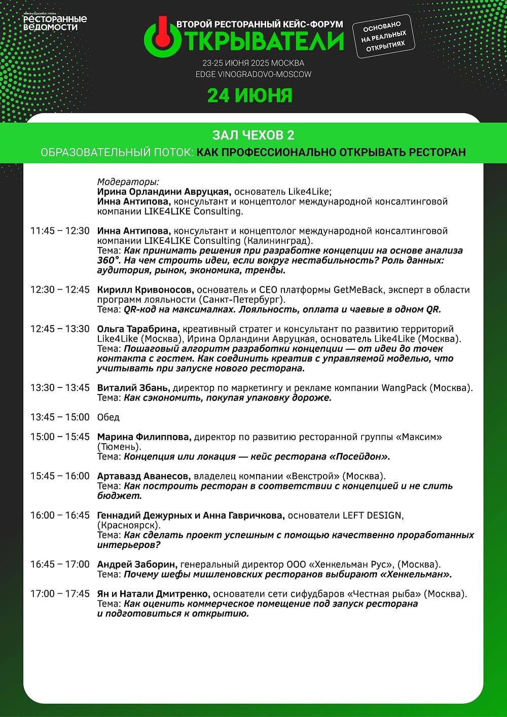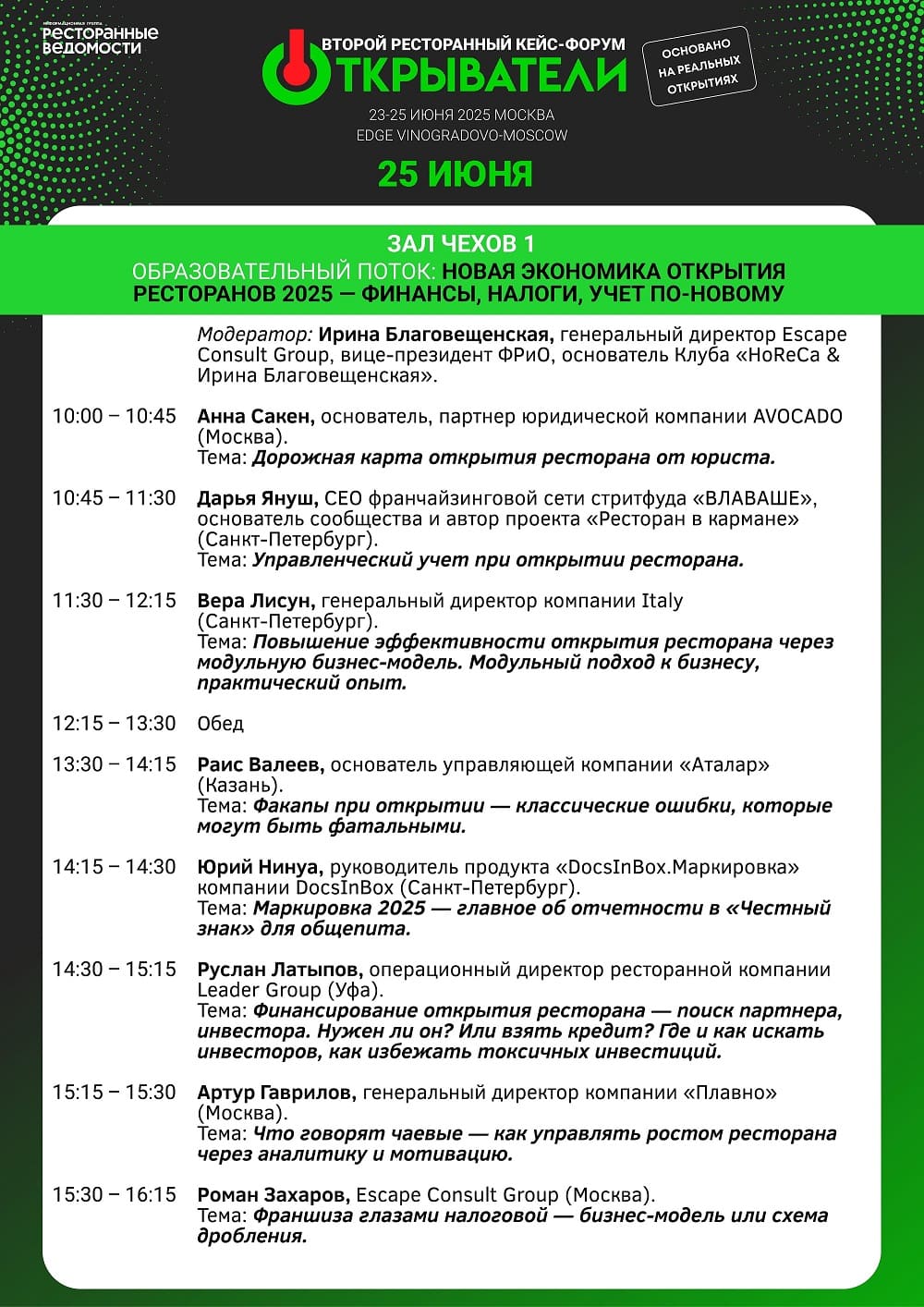 Опыт и экспертиза: 25 лет в HoReCa (услуги питания); 50+ проектов от старта до прибыли; 1000+ проверенных рабочих инструментов; 7 регионов России