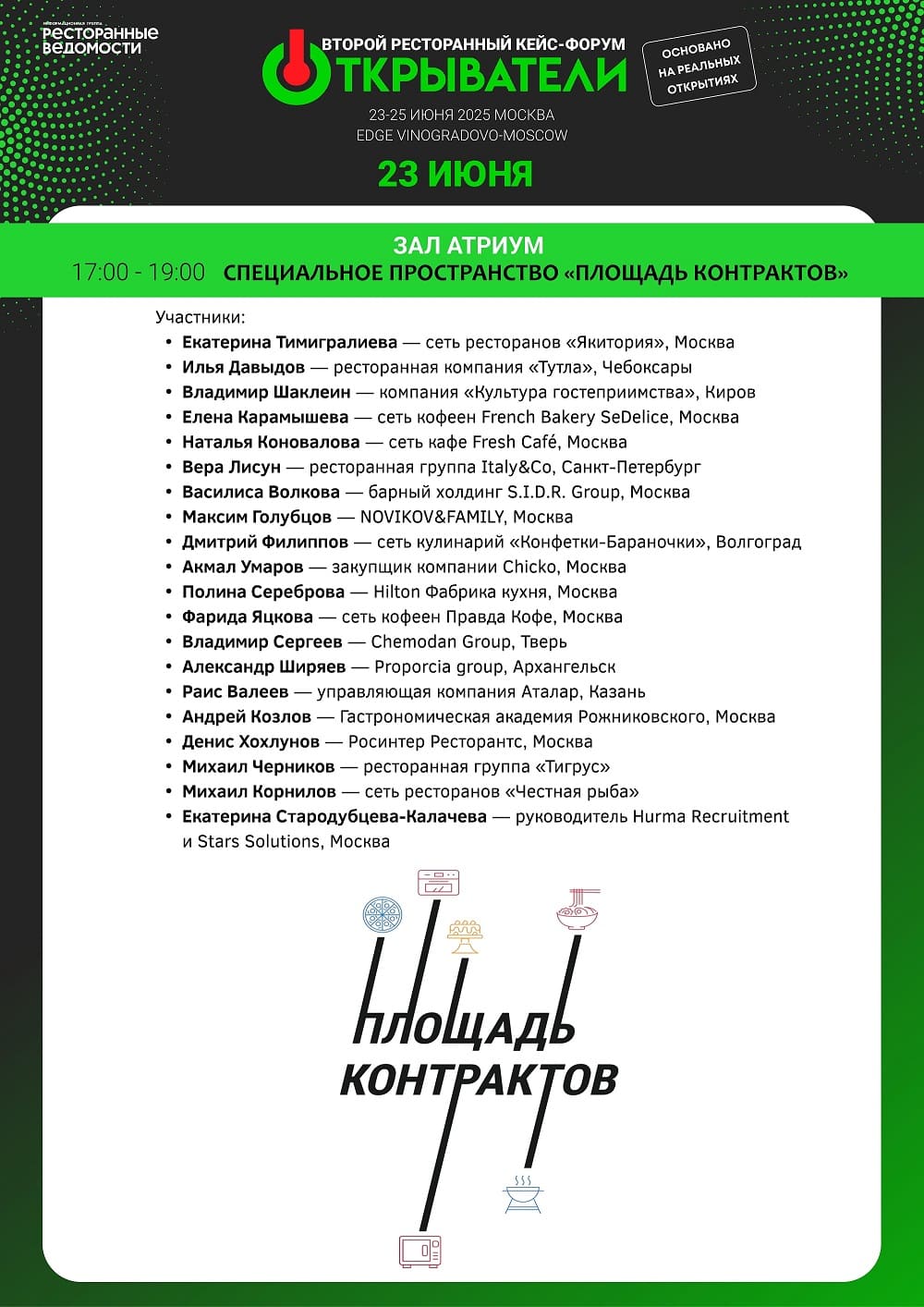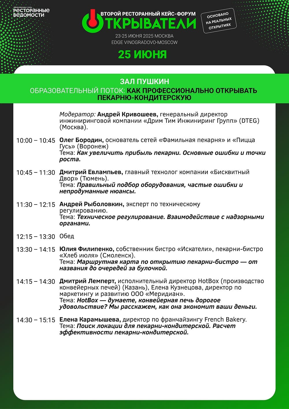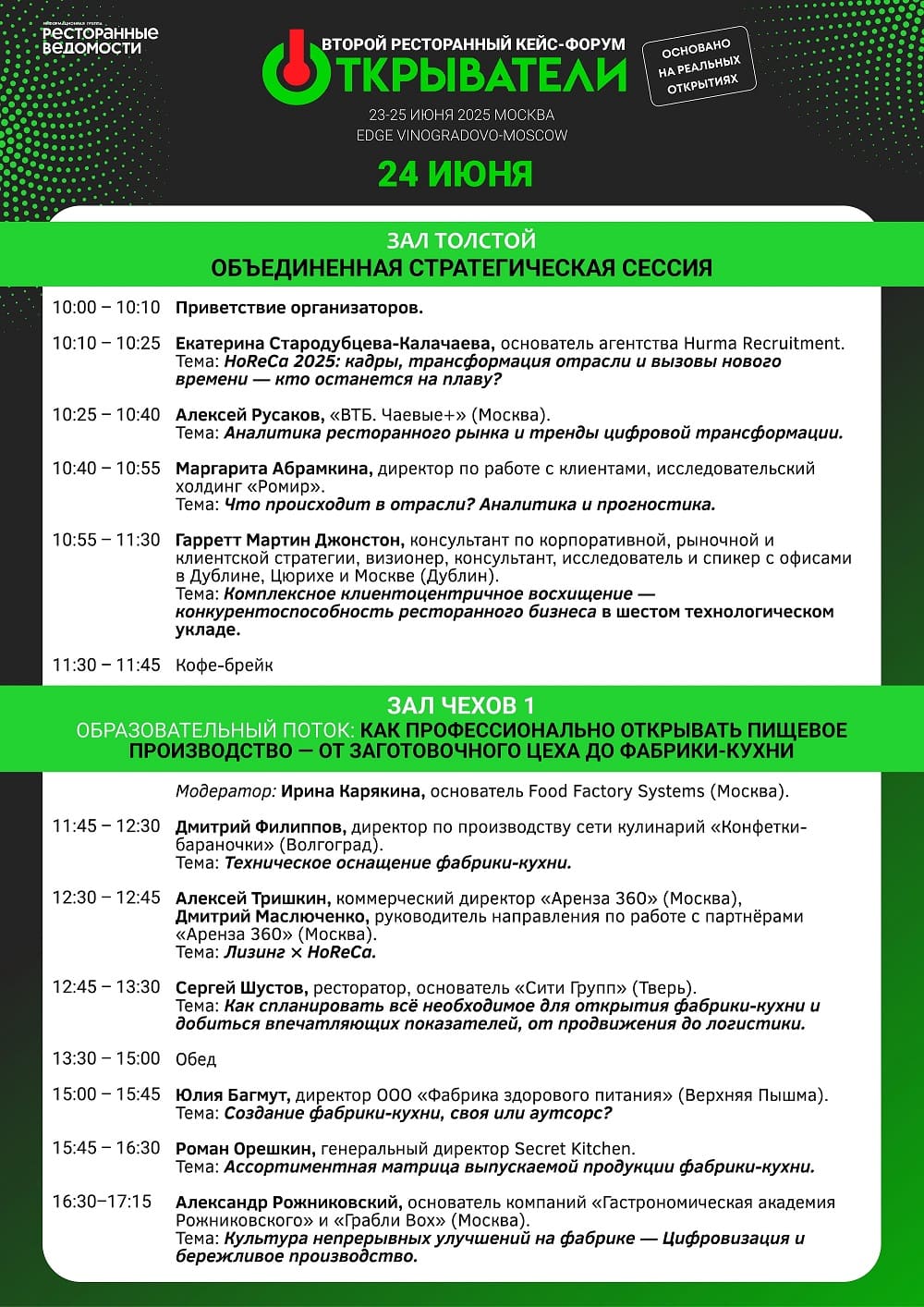 Опыт и экспертиза: 25 лет в HoReCa (услуги питания); 50+ проектов от старта до прибыли; 1000+ проверенных рабочих инструментов; 7 регионов России